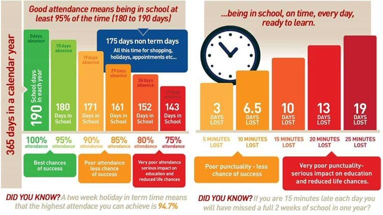 The tables below identify the possible amount of lost learning due to low attendance/ punctuality. Frequent absence/lateness can add up to a considerable amount of lost learning and can seriously disadvantage your child in adult life. Your child needs to attend school for at least 180 out of 190 days to meet our 95% expectation.